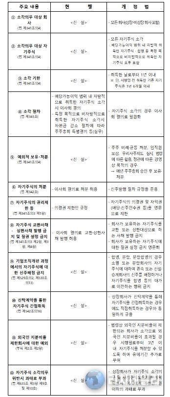 또한, 개정안은 모든 자기주식의 소각을 ‘이사회 결의’로 하도록 하여 소각 절차를 간소화했고, 법령상 외국인 지분비율이 제한되는 회사가 소각으로 외국인 지분비율이 초과될 경우 시행일로부터 3년 이내 자기주식을 처분할 수 있도록 하여 유예기간을 추가로 부여했다.