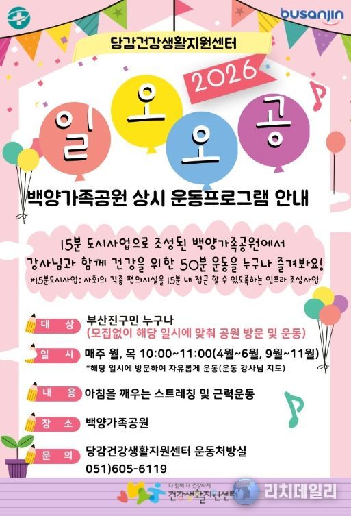 리치데일리 김상현 기자 | 부산진구 당감건강생활지원센터에서는 15분 도시사업의 일환으로 새롭게 조성된 백양가족공원에서 지역 주민을 대상으로 50분간 운동한다는 의미의 일오오공(1550)교실을 운영한다고 밝혔다.