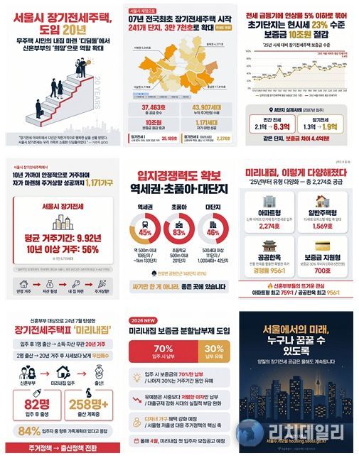 ‘장기전세주택’은 무주택 시민에게 장기간 안정적인 거주 환경을 제공하며 2007년부터 현재까지 241개 단지, 총 37,463호를 공급해 왔다. 지난 2024년에는 신혼부부에 특화된 ‘미리내집(장기전세주택Ⅱ)’을 새롭게 도입해 저출생 대응 주거정책으로 기능을 확대하고 있다. 현재 거주 중인 세대를 포함해 지금까지 총 43,907가구에 안정적인 주거를 제공했다.