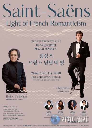 ‘생상스, 프랑스 낭만의 빛’을 부제로 백진현 음악감독 겸 상임지휘자가 지휘하고, 피아니스트 알렉 쉬친이 협연한다. 이번 공연은 생상스의 초기 음악 세계를 조망함과 동시에, 대구와 일본 히로시마의 교향악단이 음악으로 하나 되는 특별한 무대다.