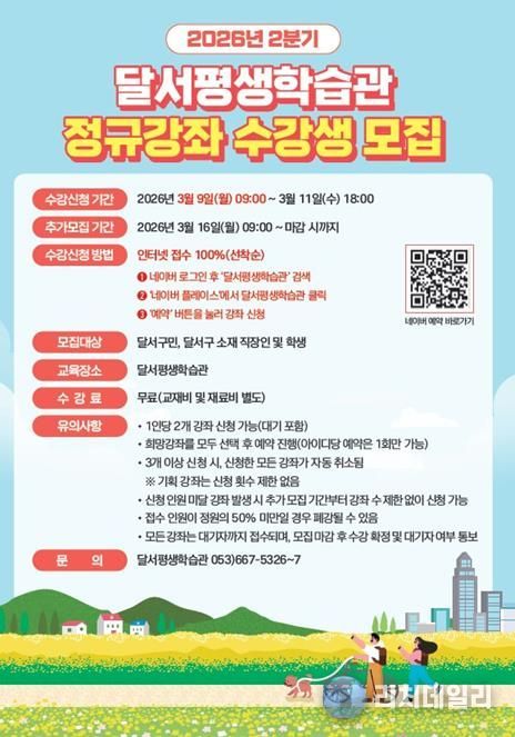 리치데일리 김상현 기자 | 대구 달서구는 3월 9일 부터‘2026년 2분기 달서평생학습관 정규강좌’수강생을 선착순 모집한다.