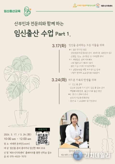 제주시가족센터는 3월 31일 ‘임신출산수업 part 2. 나를 위한 향기로운 마음챙김’ 프로그램도 운영할 예정이며, 해당 강좌도 선착순 15명에 한해 무료로 진행된다.
