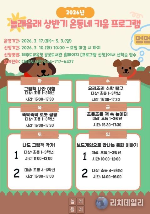 리치데일리 김상현 기자 | 제주도교육청 제주도서관은 도내 초등학생들의 알찬 방과 후와 주말 활동을 지원하기 위해 2026년 상반기 주중·주말 온동네 키움 프로그램’을 본격 운영한다.