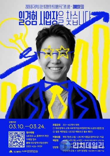 참여업체 모집은 3월 10일부터 24일까지며, 대구시 청년센터 홈페이지 또는 대구청년 커뮤니티 포털 ‘젊프’(dgjump.com)를 통해 온라인으로 신청받는다.
