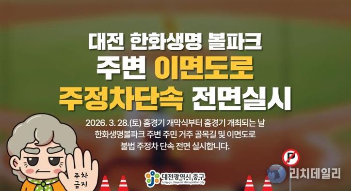 리치데일리 김상현 기자 | 대전 중구는 대전 한화생명 볼파크 야구 홈경기 개막전이 열리는 오는 28일부터‘대전 한화생명 볼파크’주변의 불법주정차 단속을 전면 시행한다고 밝혔다.