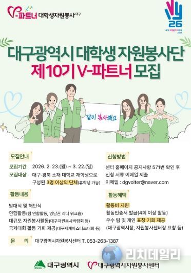 리치데일리 김상현 기자 | 대구광역시는 대구광역시자원봉사센터와 함께 지역사회 혁신과 자원봉사 문화 확산을 이끌어갈 ‘제10기 V(Volunteer)-파트너 대학생 자원봉사단’ 참여자를 오는 3월 22일까지 모집한다.
