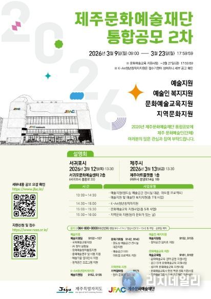 리치데일리 김상현 기자 | 제주문화예술재단은 도내 예술인의 창작 활동 지원과 지속가능한 문화예술 생태계 조성을 위해 ‘2026년 지원사업 통합공모 2차’를 3월 23일까지 진행한다.