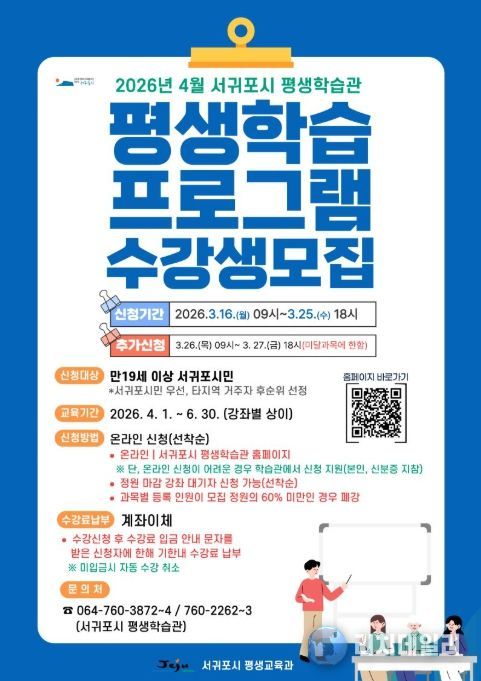 리치데일리 김상현 기자 | 서귀포시는 시민의 다양한 배움의 기회를 제공하기 위해 2026년 4월 개강 서귀포시 평생학습관 프로그램 수강생을 모집한다고 밝혔다.