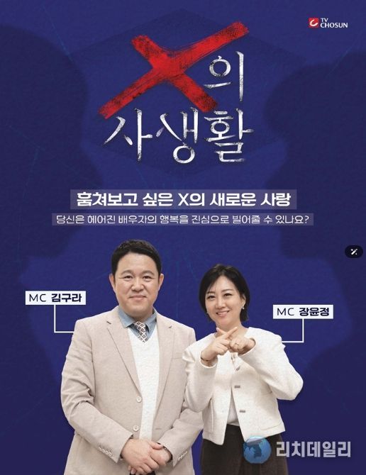 오는 3월 17일(화) 밤 10시 첫 방송되는 TV CHOSUN ‘X의 사생활’은 이혼한 전 배우자의 일상을 지켜보는 리얼 관찰 프로그램이다. 한때는 누구보다 가까웠지만 이제는 ‘남보다 못한 사이’가 된 두 사람이 각자의 삶을 살아가는 모습을 통해 관계가 끝난 뒤에도 남아 있는 감정과 변화의 과정을 담는다. 일명 ‘이혼 부부들의 입장 정리 리얼리티’로, MC 김구라와 장윤정을 중심으로 패널 천록담, 정경미가 합류해 환상의 라인업을 완성했다.