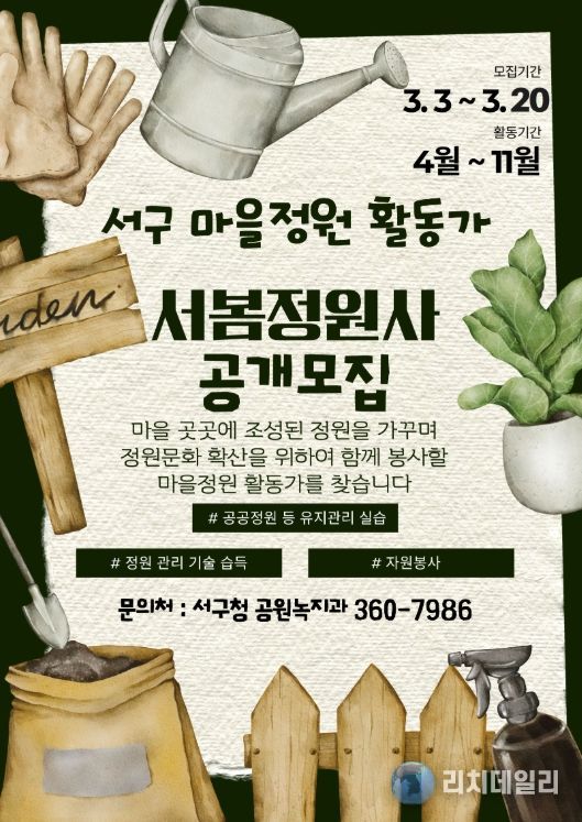 서구는 오는 20일까지 서봄정원사 50명을 모집하며 정원과 꽃을 좋아하고 마을 환경 가꾸기에 관심 있는 서구 주민이면 누구나 지원할 수 있다.