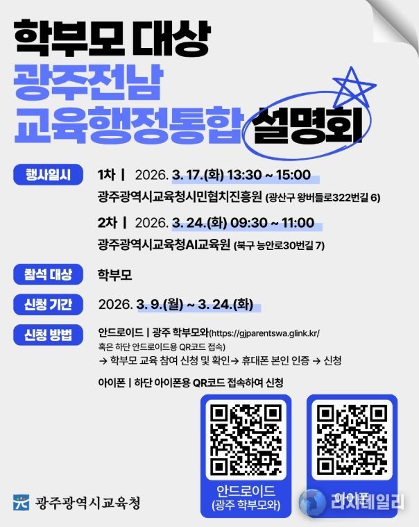 리치데일리 김상현 기자 | 광주시교육청이 학부모의 교육행정통합 궁금증을 해소하기 위해 두 차례에 걸쳐 ‘광주·전남 교육행정통합 설명회’를 개최한다.