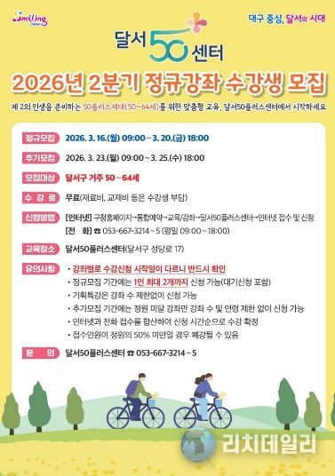 리치데일리 김상현 기자 | 대구 달서구는 50플러스세대의 역량 강화와 자기계발을 지원하기 위해‘2026년 2분기 달서50플러스센터 정규강좌’수강생을 3월 16일부터 25일까지 선착순 모집한다.