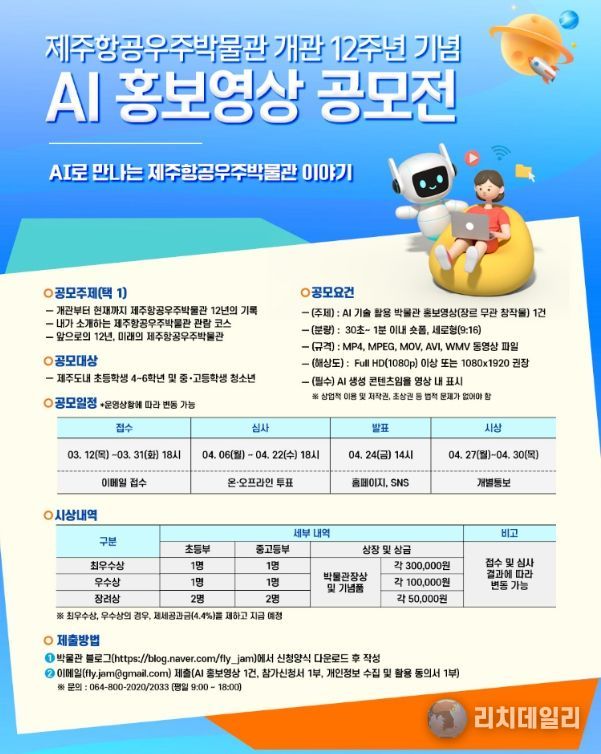 리치데일리 김상현 기자 | 제주국제자유도시개발센터에서 운영하는 제주항공우주박물관은 개관 12주년을 맞아‘AI 홍보영상 공모전’을 개최한다고 밝혔다.