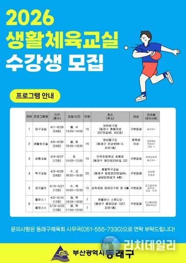 리치데일리 김상현 기자 | 부산 동래구는 지역 주민의 생활체육 참여 확대와 건강한 여가 활동 지원을 위해 ‘2026년 상반기 생활체육교실’ 수강생을 모집한다고 밝혔다.