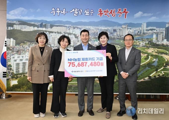 리치데일리 김상현 기자 | NH농협은행 옥교동지점이 3월 12일 오전 10시 30분 중구청 구청장실을 방문해 제휴카드 발전 기금 7,568만 원을 전달했다.