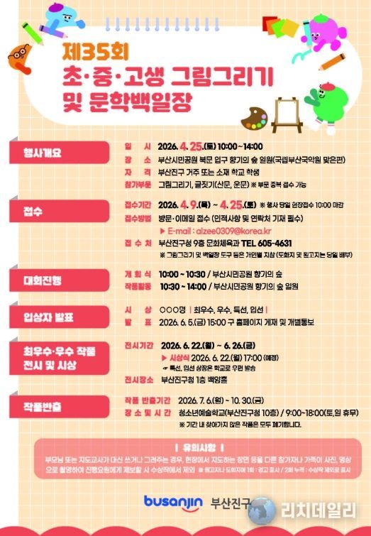 리치데일리 김상현 기자 | 부산진구는 오는 4월 25일 오전 10시 부산시민공원 향기의 숲 일원에서‘제35회 초·중·고생 그림그리기 및 문학백일장’을 개최한다.