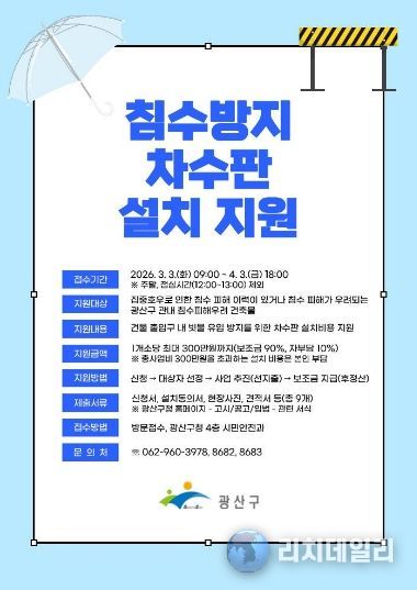 리치데일리 김상현 기자 | 광주 광산구가 집중호우로 인한 침수 피해 예방을 위해 ‘2026년 광산구 침수방지 차수판 설치 지원사업’을 추진한다.