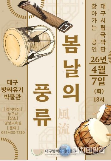 리치데일리 김상현 기자 | 대구문화예술진흥원 박물관운영본부 소속 대구방짜유기박물관은 봄날에 팔공산 역사문화 특강과 국악 공연을 기획해 3월 24일 오후 2시에 ‘탁본자료로 만나는 팔공산 역사문화 깊이’를, 4월 7일 오후 1시에 대구시립국악단 찾아가는 공연 ‘봄날의 풍류’를 개최한다.