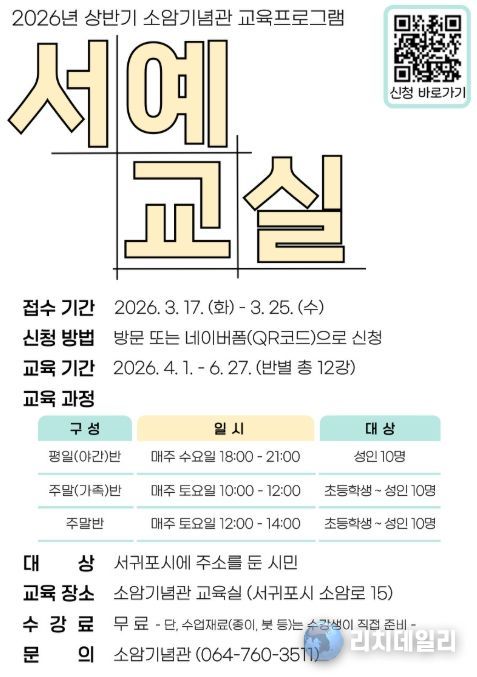 리치데일리 김상현 기자 | 서귀포공립미술관은 4월부터 6월까지 운영되는 소암기념관 상반기 교육프로그램 ‘서예교실’의 수강생을 모집한다고 밝혔다.