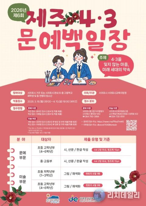 리치데일리 김상현 기자 | 서귀포시와 서귀포시교육지원청은 제주4‧3 제78주년을 기념하여 제주4‧3의 평화‧화해‧상생 정신을 계승하고, 4‧3의 올바른 역사의식을 고취하기 위해 제6회 제주4‧3 문예백일장을 개최한다.
