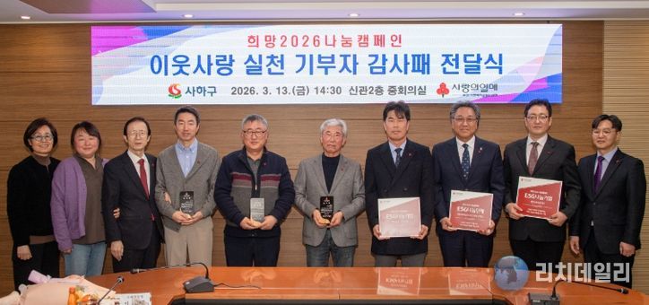 리치데일리 김상현 기자 | 부산 사하구는 부산사회복지공동모금회(회장 이수태)와 지난 13일 '희망2026나눔캠페인 이웃사랑 실천 기부자 감사패 전달식'을 개최해 지역사회 나눔을 실천한 기부자들에게 감사의 뜻을 전했다고 밝혔다.
