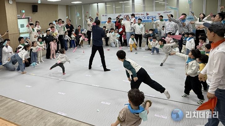 이어진 2부 행사에서는 아빠와 자녀가 함께하는 ‘스킨십 레크리에이션’ 프로그램이 진행됐다. 참가 가족들은 함께 몸을 움직이며 즐거운 시간을 보내고 서로 교류하며 ‘육아 동지’로서 첫 만남을 가졌다.