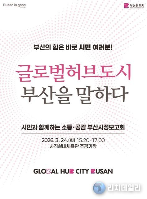 리치데일리 김상현 기자 | 부산시는 오는 24일 오후 3시 20분 사직실내체육관 주경기장에서 시민과 지역 주요 인사 등이 참석한 가운데 '글로벌허브도시 부산을 말하다' 시정보고회를 개최한다고 밝혔다.
