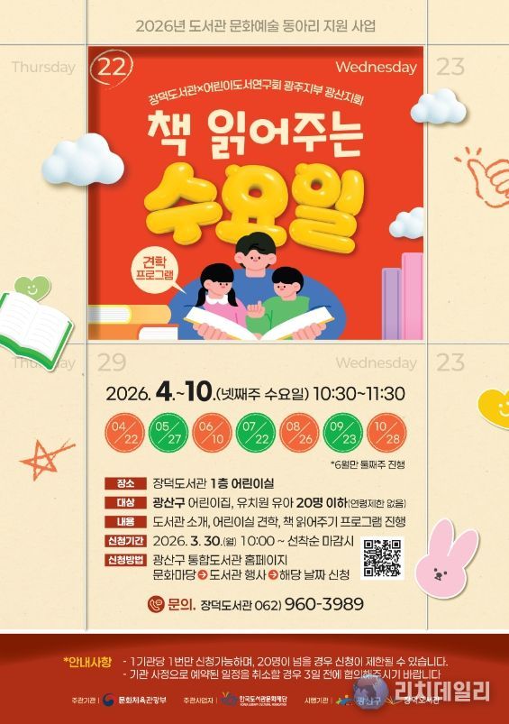 책 읽어주는 수요일은 오는 30일 오전 10시부터 참여기관을 모집하며 광산구 통합도서관 누리집을 통해 선착순으로 진행한다. 일정과 자세한 사항은 누리집 공지사항에서 확인하면 된다.