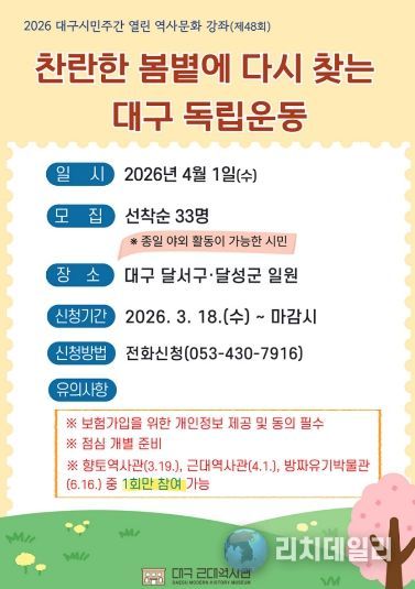 리치데일리 김상현 기자 | (재)대구문화예술진흥원 박물관운영본부 소속 대구근대역사관은 2026 대구시민주간 연계행사로 4월 1일 대구시 달서구와 달성군 일원의 대구 독립운동가와 문화유산을 찾아보는 ‘찬란한 봄볕에 다시 찾는 대구 독립운동’ 답사를 개최하며, 참가자를 모집한다.