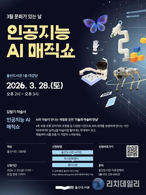 리치데일리 김상현 기자 | 울산도서관은 오는 3월 28일 오후 2시 도서관 1층 대강당에서 3월 문화가 있는 날 행사로 ‘인공지능(AI) 마술(매직)쇼’ 공연을 개최한다고 밝혔다.