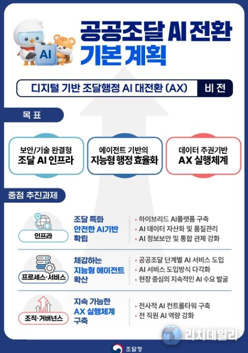리치데일리 김상현 기자 | 조달청은 공공조달에서 활용가능한 AI 서비스의 지속적인 발굴과 안정적이고 체계적인 서비스 제공을 위해 '공공조달 AI 전환 기본계획'을 마련했다고 19일 밝혔다.