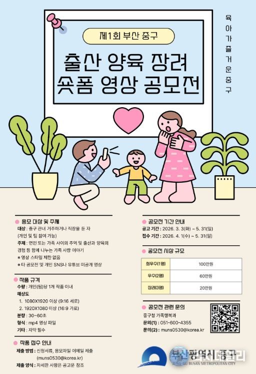 리치데일리 김상현 기자 | 부산 중구는 출산과 양육의 긍정적인 가치를 확산하기 위해 제1회 '중구 출산·양육 장려 숏폼 영상 공모전'을 개최한다.