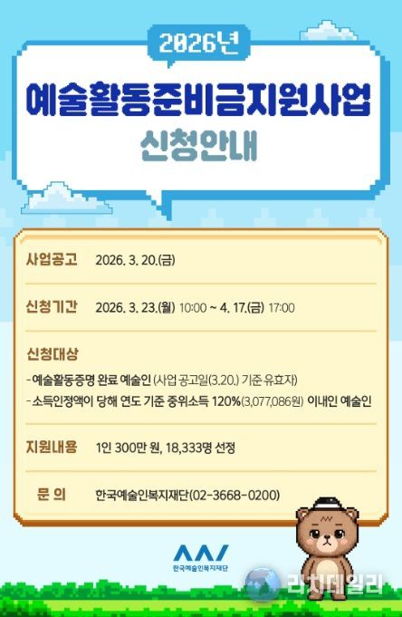 리치데일리 김상현 기자 | 문화체육관광부는 한국예술인복지재단과 함께 3월 23일부터 4월 17일까지 ‘2026년 예술활동준비금’ 지원 신청을 받는다.