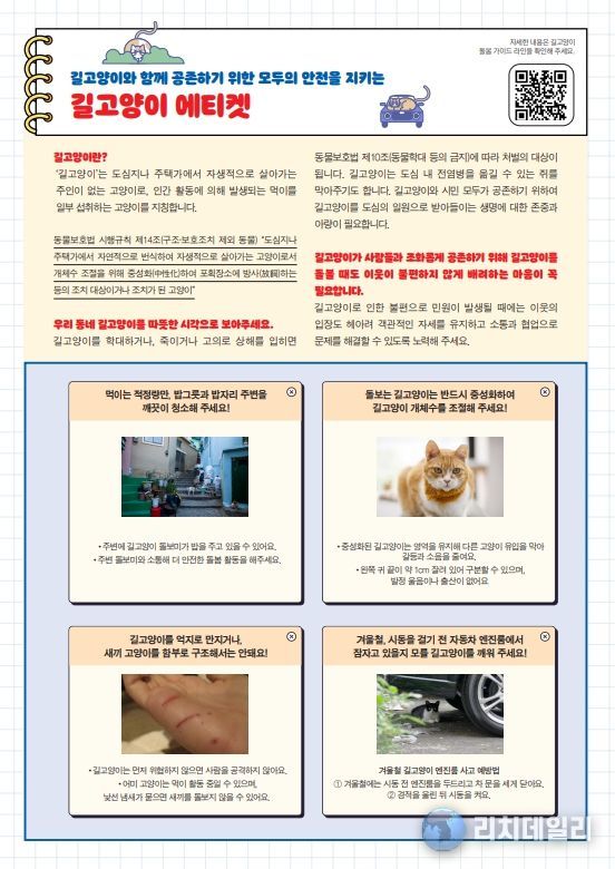 「길고양이 돌봄 가이드라인」은 ‘국가 동물보호정보시스템’, ‘동물사랑배움터’ 및 지자체 누리집에서 내려받을 수 있으며, 리플릿 내 QR코드를 통해 현장에서 바로 가이드라인의 구체적 내용도 확인가능하다.