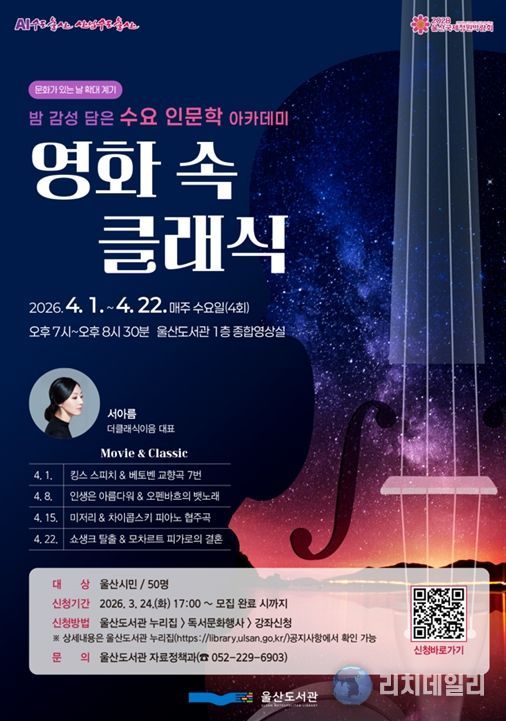 이번 수요 인문학 아카데미 '영화 속 클래식' 강좌는 4월 1일부터 4월 22일까지 매주 수요일 오후 7시, 도서관 1층 종합영상실에서 4회에 걸쳐 진행된다.
