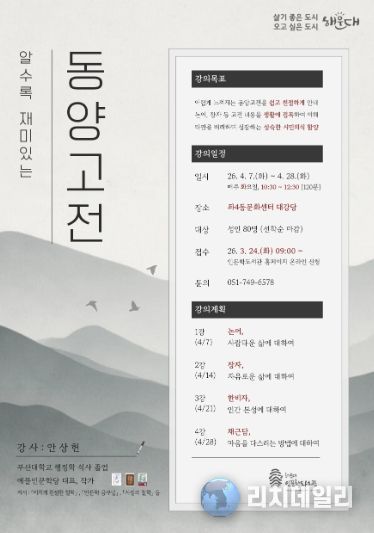 리치데일리 김상현 기자 | 해운대구가 새봄을 맞아 지역 주민들의 인문학적 갈증을 해소하기 위한 특별한 자리를 마련한다.