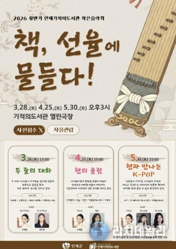 리치데일리 김상현 기자 | 인제기적의도서관이 책과 음악이 어우러지는 문화공간으로 거듭나기 위해 오는 3월 28일 오후 3시 도서관 열린극장에서 2026년 상반기 작은음악회 '책, 선율에 물들다!'를 개최한다.