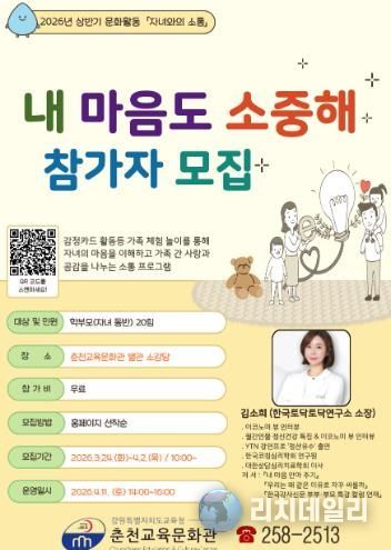 리치데일리 김상현 기자 | 춘천교육문화관은 4월 11일 오후 2시 본관 소강당에서 부모와 자녀가 함께 참여하는 가족 체험형 프로그램 ‘내 마음도 소중해’를 운영한다.