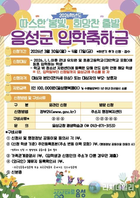 리치데일리 김상현 기자 | 음성군은 올해 2026학년도 입학을 맞아 관내 유치원과 초·중·고등학교 입학생, 그리고 학교 밖 청소년지원센터에 등록된 입학 연령에 해당되는 청소년을 대상으로 입학축하금을 지원한다고 밝혔다.
