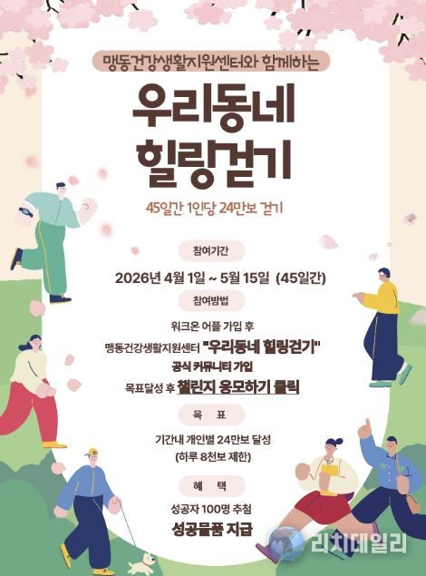 리치데일리 김상현 기자 | 충북 음성군 맹동건강생활지원센터는 주민들의 걷기 실천율을 높이고 비만, 우울, 고혈압 등 기저질환 관리를 돕기 위해 오는 4월부터 ‘우리동네 힐링걷기’ 챌린지를 운영한다.