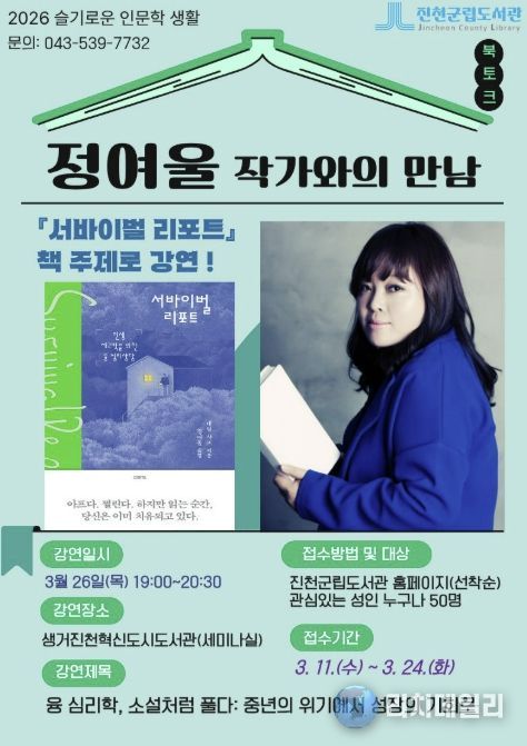 첫 강연은 3월 26일 오후 7시 생거진천 혁신도시도서관에서 열리며, 심리학 분야 작가인 정여울이 참여해 독자들과 만남의 시간을 갖는다.