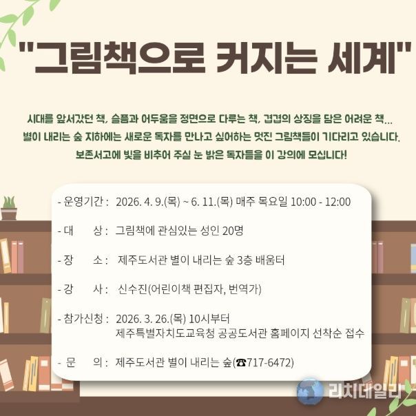 리치데일리 김상현 기자 | 제주도교육청 제주도서관은 4월 9일부터 6월 11일까지 자료실 보존서고에 소장된 그림책을 재조명하고 지역주민에게 깊이 있는 독서 경험을 제공하기 위해 ‘그림책으로 커지는 세계’ 참가자를 모집한다.