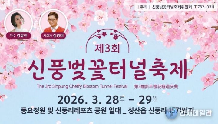 리치데일리 김상현 기자 | 서귀포시는 몸과 마음이 가벼워지는 따스한 봄, 가족・연인・친구 간의 잊지 못할 추억을 선사할 제3회 신풍벚꽃터널축제가 28일~29일 양일간 성산읍 풍요정원 및 신풍리레포츠 공원 일원에서 개최된다고 밝혔다.