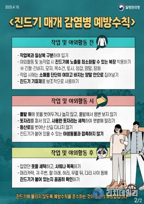 진드기에 물리지 않는 3단계 예방 수칙은 (1단계) 야외 활동 전 작업복 착용 시 소매를 단단히 여미고 바지는 양말 안으로 집어 넣는 등 피부 노출을 최소화한다. (2단계) 야외 활동 후에는 작업복을 털어 즉시 세탁하고, 귀가 후 바로 샤워하며 진드기에 물린 흔적이 있는지 꼼꼼히 관찰한다. (3단계) 야외활동 후 2주 이내 고열, 구토 등의 증상이 나타나면 즉시 의료기관을 방문하여 치료받는다.