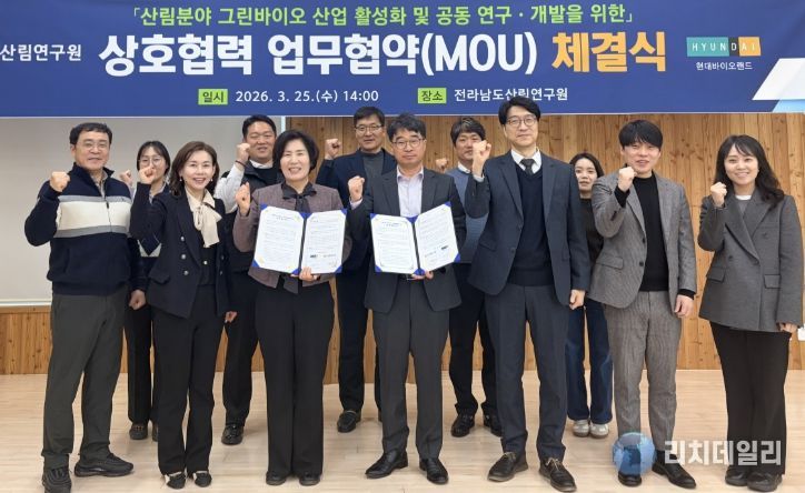 리치데일리 김상현 기자 | 전라남도산림연구원이 25일 ㈜현대바이오랜드와 산림자원을 활용한 그린바이오 산업 활성화를 위해 업무협약을 하고, 고부가가치 제품 개발과 원물의 안정적 생산체계 구축을 위한 상호 협력에 나섰다.