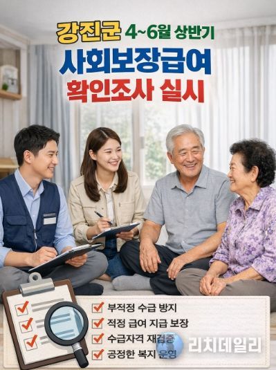 리치데일리 김상현 기자 | 강진군이 오는 4월부터 6월까지 2026년 상반기 사회보장급여 확인조사를 실시한다. 이번 조사는 부정수급을 예방하고 복지급여의 적정성을 높이는 동시에 지원이 필요한 가구를 다시 살펴 복지 사각지대를 줄이기 위한 것이다.