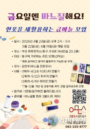 리치데일리 김상현 기자 | 광주 동구는 헌옷을 이용해 생활소품을 만드는 새활용 프로그램 ‘금요일엔 바느질해요! 헌옷을 새활용하는 금바늘 모임’ 참가자를 모집한다.