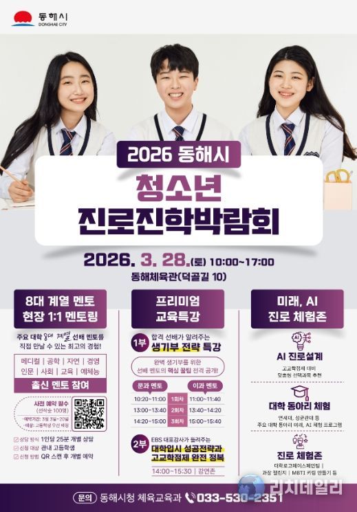 천수정 동해시 체육교육과장은 “이번 박람회가 학생들의 진로 고민에 실질적 도움이 되길 바란다”며 “앞으로도 청소년의 자기주도적 진로 설계를 지원하는 다양한 프로그램을 확대해 나가겠다”고 말했다.