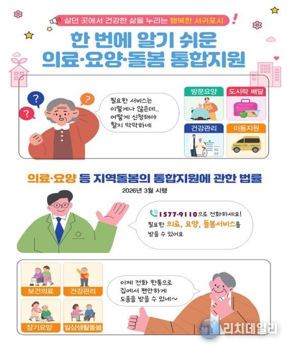 리치데일리 김상현 기자 | 서귀포시는 3월 27일 '돌봄통합지원법' 시행에 맞춰 어르신과 장애인이 평소 살던 곳에서 존엄한 일상을 보낼 수 있도록 돕는 ‘의료·요양 통합돌봄’ 사업을 전격 추진한다.