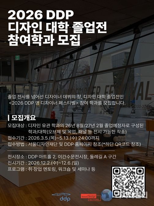 서울디자인재단은 DDP를 중심으로 미래 디자인 산업을 이끌어 나갈 청년 디자이너를 발굴, 성장 기회를 제공하기 위한 2026 DDP 영디자이너페스티벌 디자인대학 졸업전, 2026 DDP디자인페어 대학 협업 프로그램 ‘영디자이너 특별관’ 참가자를 모집한다고 밝혔다.